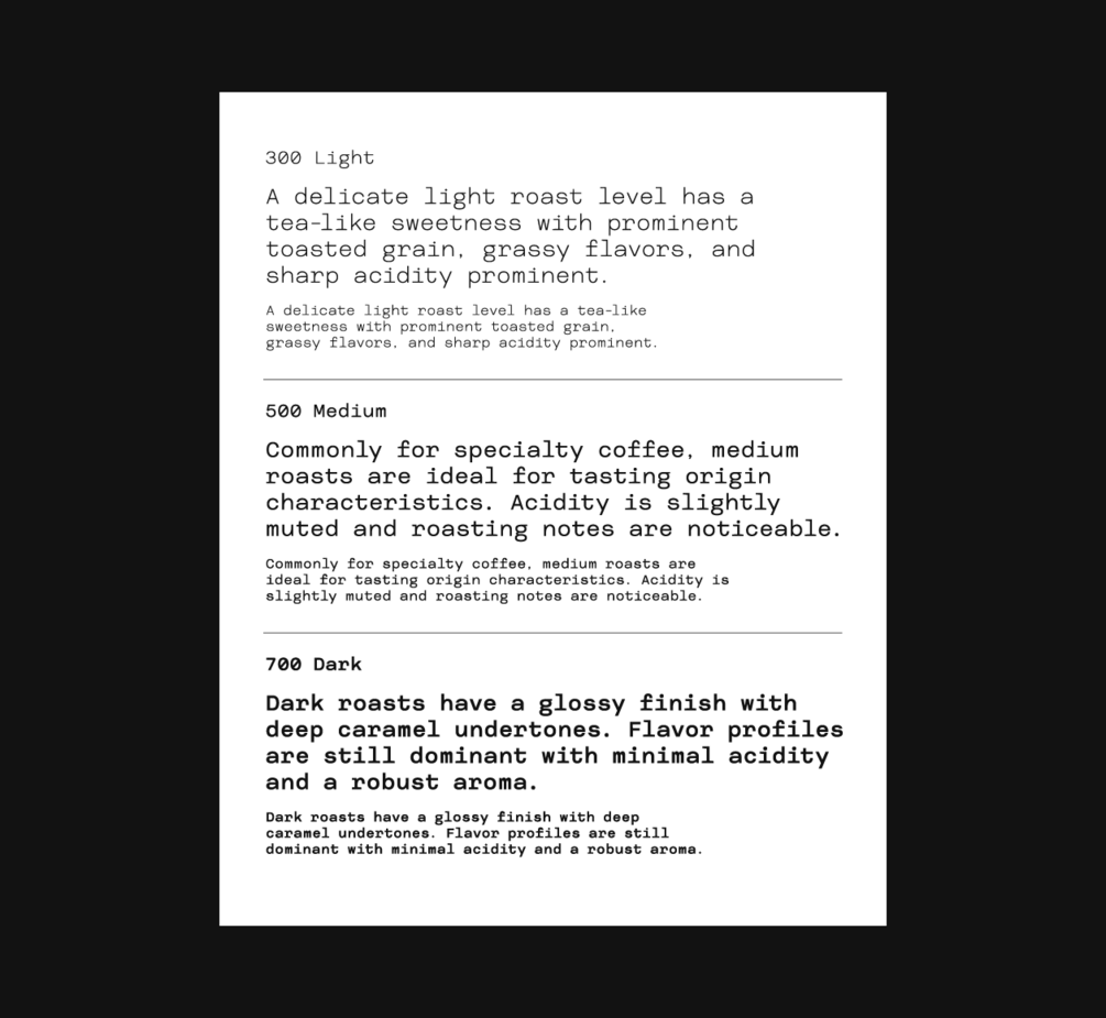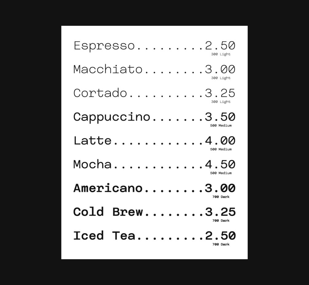 A geometric monospaced font that strives to be used in a variety of applications. Imagine it on coffee packaging, restaurant menus, or personal care products.