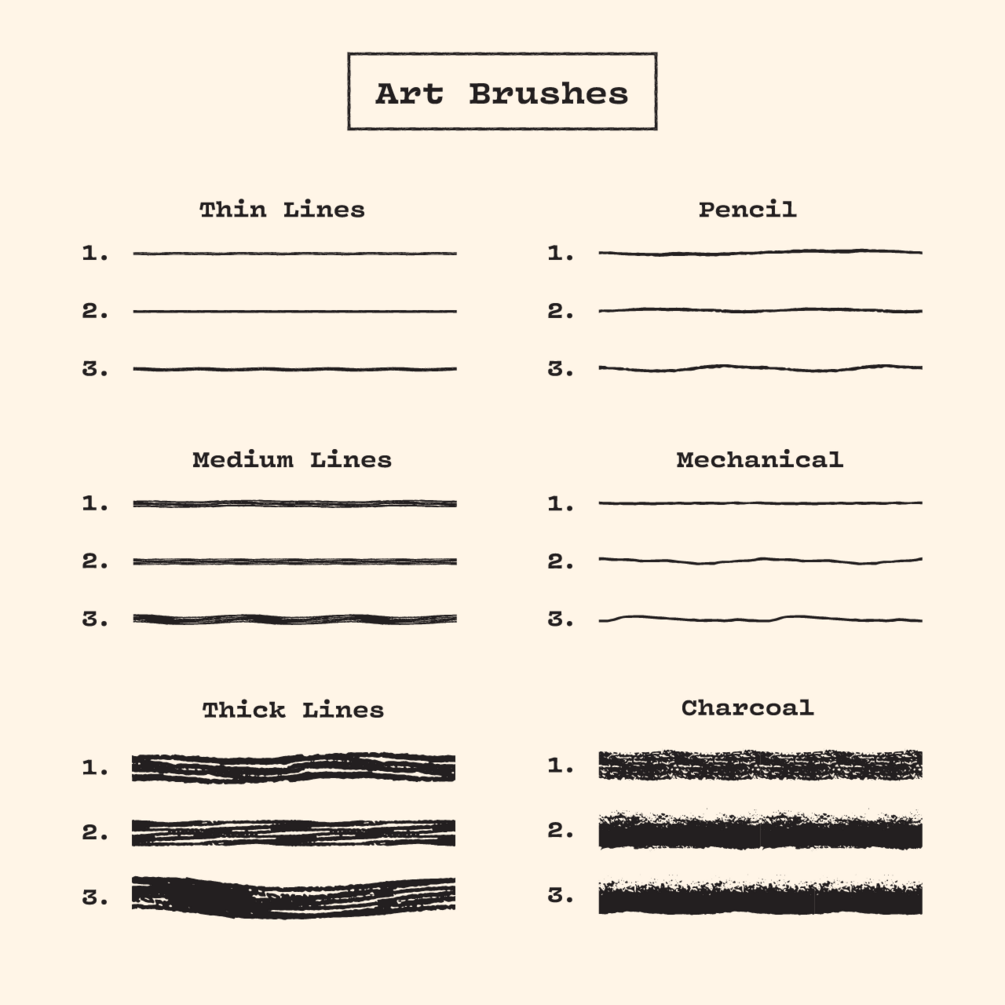 This pack includes 18 Art Brushes, 8 Scatter Brushes, and 8 Seamless Textures.